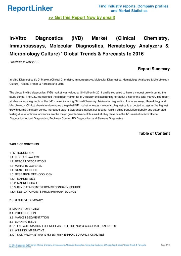 Publish the market estimates of the In Vitro Diagnostic (IVD) industry in Europe, testing and clinical chemistry overall. Despite the increasing number of Type II separate market segments, but less dramatically than 2013. Laboratory diagnostics (reagents and instruments) grew by 0.7%. ... Content Retrieval